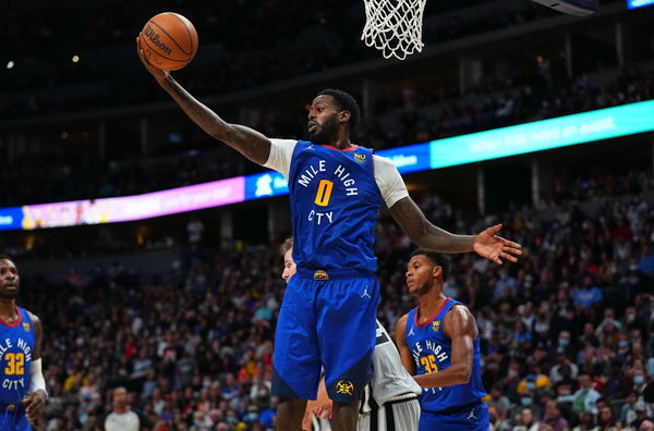 Oct 22, 2021; Denver, Colorado, USA; Denver Nuggets forward JaMychal Green (0) pulls in a rebound in the second half against the San Antonio Spurs at Ball Arena. Mandatory Credit: Ron Chenoy-USA TODAY Sports