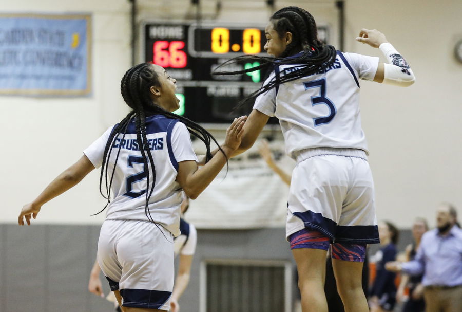 Morris Catholic’s Mya Pauldo (2) and Mia Pauldo (3) react after Mya nailed a three-pointer at the buzzer in the Crusaders 69-56 win. The Morris County Tournament girls basketball semifinal game between Morris Catholic and Chatham at County College of Morris in Randolph, NJ on Friday, February 18, 2022.