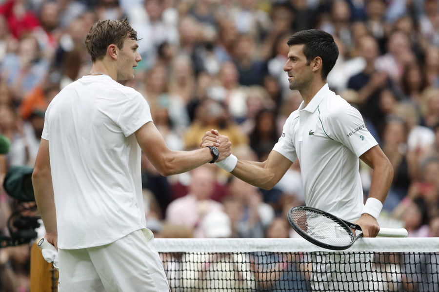 Tennis – Wimbledon – All England Lawn Tennis and Croquet Club, London, Britain – June 28, 2021 Serbia’s Novak Djokovic shakes hands with Britain’s Jack Draper after winning their first round match REUTERS/Paul Childs
