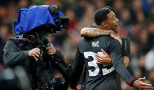 Football Soccer – Stoke City v Liverpool – Capital One Cup Semi Final First Leg – Britannia Stadium – 5/1/16 Jordon Ibe celebrates with team mates after scoring the first goal for Liverpool Action Images via Reuters / Carl Recine Livepic EDITORIAL USE ONLY. No use with unauthorized audio, video, data, fixture lists, club/league logos or “live” services. Online in-match use limited to 45 images, no video emulation. No use in betting, games or single club/league/player publications. Please contact your account representative for further details. – RTX21667