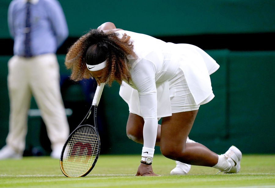 Serena Williams goes down injured during her first round ladies’ singles match against Aliaksandra Sasnovich on centre court on day two of Wimbledon at The All England Lawn Tennis and Croquet Club, Wimbledon. Picture date: Tuesday June 29, 2021. (Photo by Adam Davy/PA Images via Getty Images)