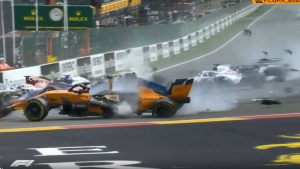Fernando Alonso had his race ended before the first lap as the Renault of Nico Hulkenberg locked up and slammed into the back of his McLaren, sending him flying over the unfortunate Sauber of Charles Leclerc, ending all of their races.