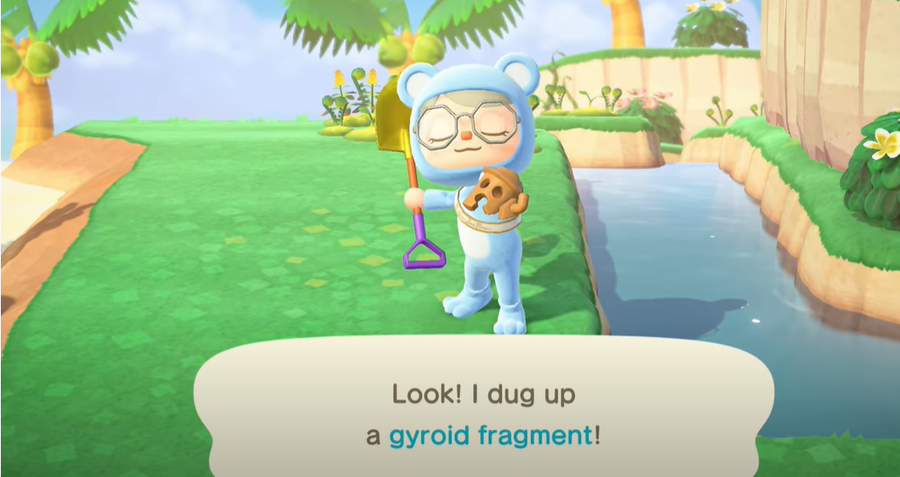 Naturally, some of the dig spots will contain fossils; however, there will be one spot that will 100% contain Gyroid. When you find a Gyroid fragment on the mysterious island, you can return to your own island. After that you have to bury the fragment and water it; the next day you will find a fully grown Gyroid by digging the same spot.