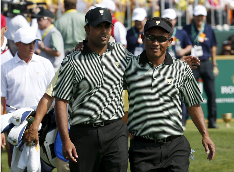 International team member Thongchai Jaidee (R) of Thailand and teammate Anirban Lahiri of India walk on the first hole during the opening foursome matches of the 2015 Presidents Cup golf tournament at the Jack Nicklaus Golf Club in Incheon, South Korea, October 8, 2015. REUTERS/Toru Hanai