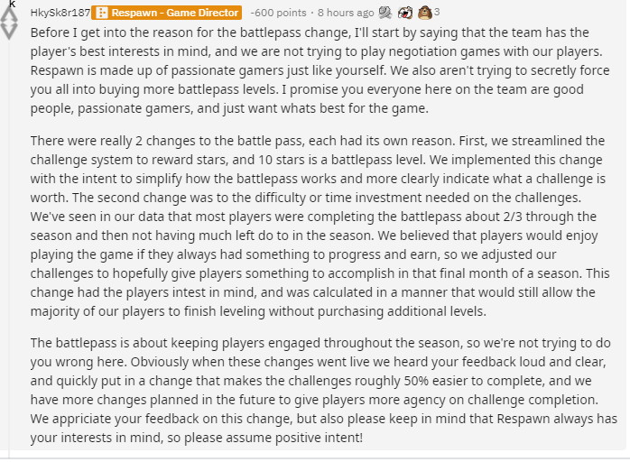 “We are not trying to play negotiation games with our players. Respawn is made up of passionate gamers, just like yourself. We also aren’t trying to secretly force you all into buying more battle pass levels.”