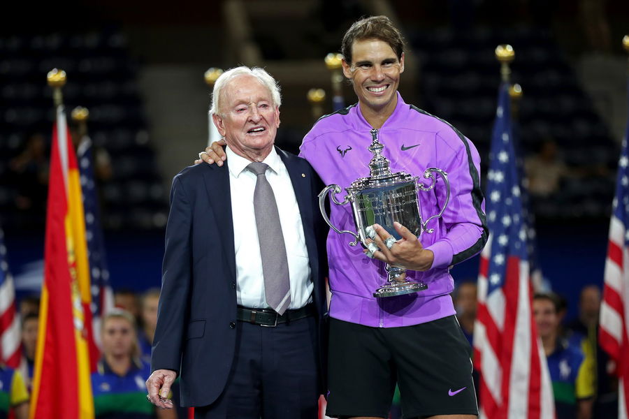 NEW YORK, NEW YORK – SEPTEMBER 08: Rafael Nadal (R) of Spain celebrates with the championship trophy alongside tennis champion Rod Laver (L) during the trophy presentation ceremony after winning his Men’s Singles final match against Daniil Medvedev of Russia on day fourteen of the 2019 US Open at the USTA Billie Jean King National Tennis Center on September 08, 2019 in the Queens borough of New York City. (Photo by Matthew Stockman/Getty Images)
