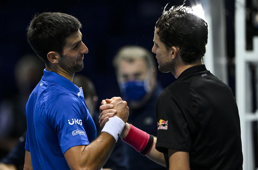 Dominic Thiem of Austria shakes hands with Novak Djokovic of Serbia after beating him on Day 7 of the Nitto ATP World Tour Finals at The O2 Arena on November 21, 2020, in London, England. (Photo by TPN/Getty Images)