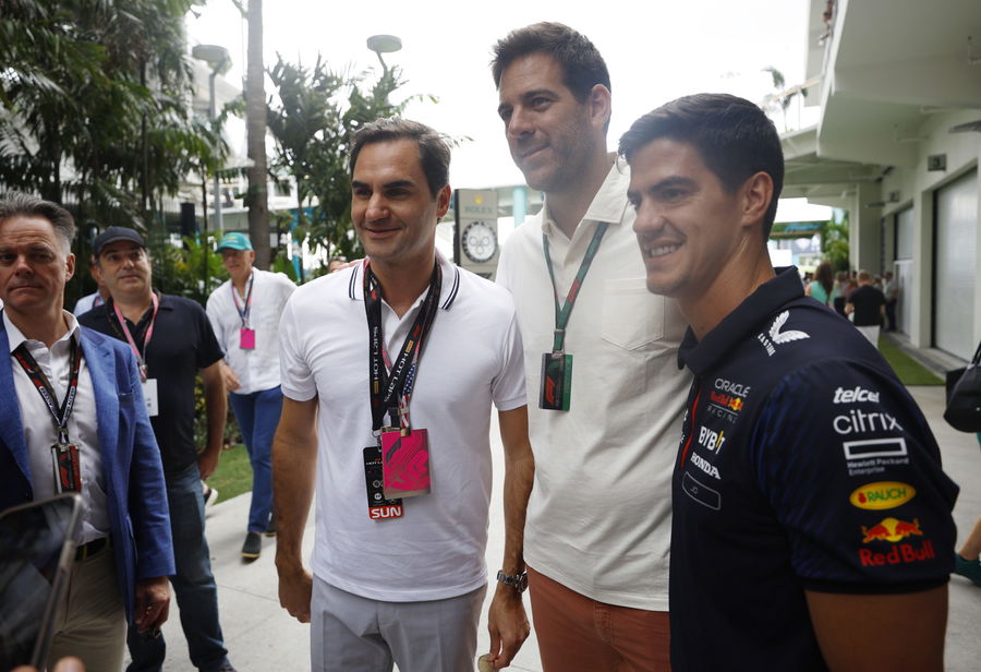 MIAMI, FLORIDA – MAY 07: Roger Federer and Juan Martin Del Potro pose for a photo in the Paddock before the F1 Grand Prix of Miami at Miami International Autodrome on May 07, 2023, in Miami, Florida. (Photo by Chris Graythen/Getty Images)