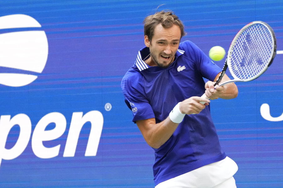 Sep 10, 2021; Flushing, NY, USA; Daniil Medvedev of Russia hits a backhand against Felix Auger-Aliassime of Canada (not pictured) on day twelve of the 2021 U.S. Open tennis tournament at USTA Billie Jean King National Tennis Center. Mandatory Credit: Robert Deutsch-USA TODAY Sports