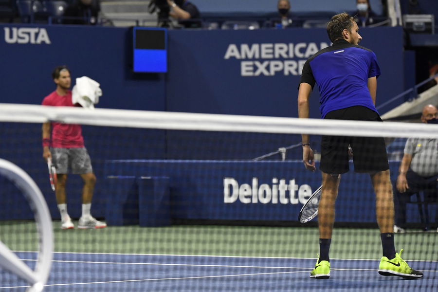 Sep 11 2020; Flushing Meadows, New York,USA; Daniil Medvedev of Russia argues a call as Dominic Thiem of Austria (L) looks on in a men’s singles semi-finals match on day twelve of the 2020 U.S. Open tennis tournament at USTA Billie Jean King National Tennis Center. Mandatory Credit: Danielle Parhizkaran-USA TODAY Sports | Credit: Reuters