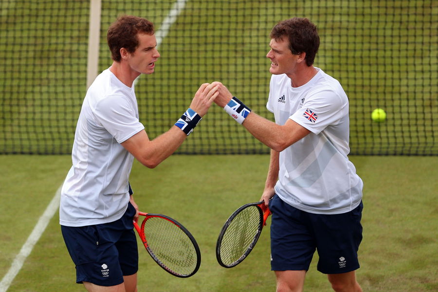 LONDON, ENGLAND – JULY 28: Andy Murray and Jamie Murray of Great Britain reacts after a point against Alexander Peya and Jurgen Melzer of Austria during their Men’s Doubles Tennis match on Day 1 of the London 2012 Olympic Games at the All England Lawn Tennis and Croquet Club in Wimbledon on July 28, 2012 in London, England. (Photo by Clive Brunskill/Getty Images)