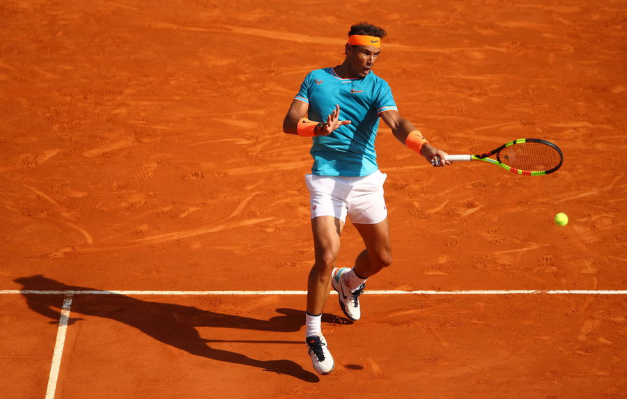 MONTE-CARLO, MONACO – APRIL 19: Rafael Nadal of Spain plays a forehand against Guido Pella of Argentinean their quarter-final match during day six of the Rolex Monte-Carlo Masters at Monte-Carlo Country Club on April 19, 2019, in Monte-Carlo, Monaco. (Photo by Clive Brunskill/Getty Images)
