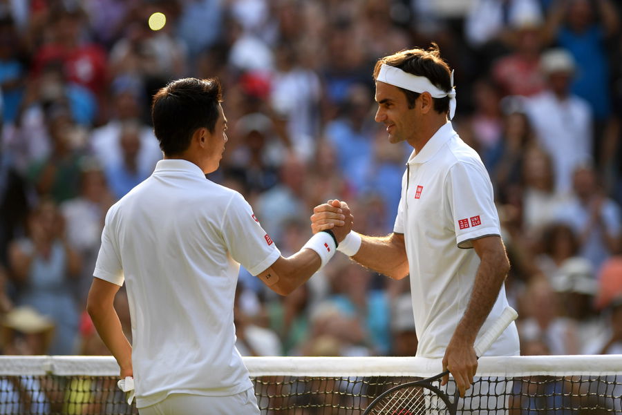 LONDON, ENGLAND – JULY 10: Roger Federer of Switzerland (R) shakes hands with Kei Nishikori of Japan following victory in his Men’s Singles Quarter Final match during Day Nine of The Championships – Wimbledon 2019 at All England Lawn Tennis and Croquet Club on July 10, 2019 in London, England. (Photo by Mike Hewitt/Getty Images)