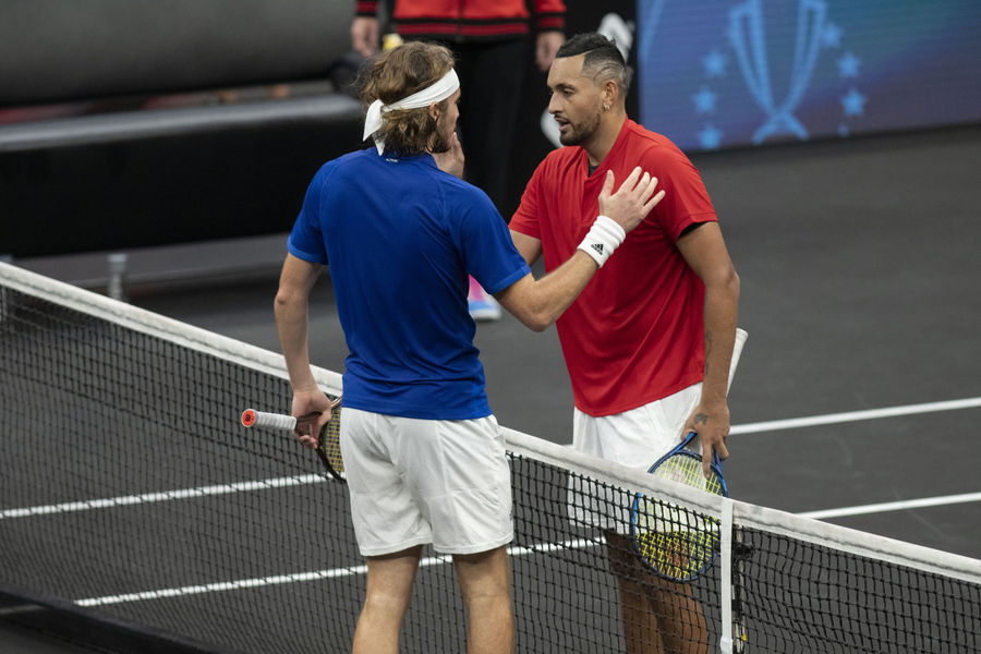 Sep 25, 2021; Boston, MA, USA; Team Europe player Stefanos Tsitsipas defeats Team World player Nick Kyrgios 6-3, 6-4 at TD Garden. Mandatory Credit: Richard Cashin-USA TODAY Sports