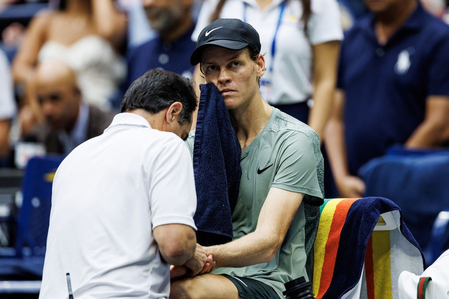 Sep 6, 2024; Flushing, NY, USA; Jannik Sinner of Italy receives medical treatment for an injury to his hand during his match against Jack Draper of Great Britain on day twelve of the U.S. Open tennis tournament at the USTA Billie Jean King National Tennis Center. Mandatory Credit: Mike Frey-Imagn Images