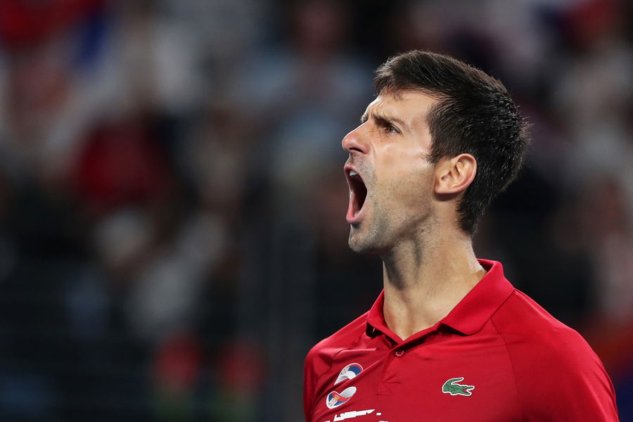 SYDNEY, AUSTRALIA – JANUARY 12: Novak Djokovic of Serbia celebrates winning a point during his final singles match against Rafael Nadal of Spain during day 10 of the ATP Cup at Ken Rosewall Arena on January 12, 2020, in Sydney, Australia. (Photo by Matt King/Getty Images)