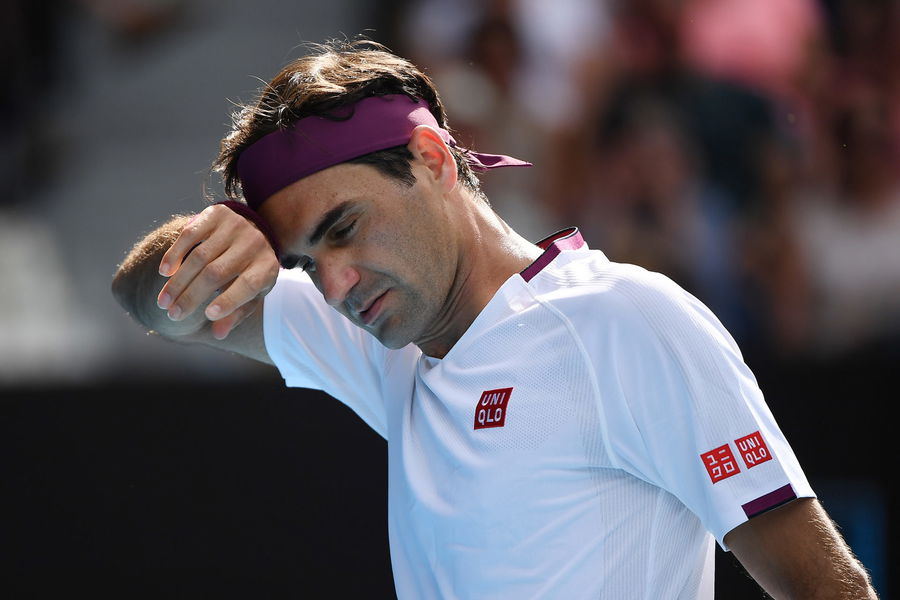Roger Federer of Switzerland looks on during his Men’s Singles Quarterfinal match against Tennys Sandgren of the United States. Day nine of the 2020 Australian Open at Melbourne Park in Melbourne, Australia. (Photo by Hannah Peters/Getty Images)