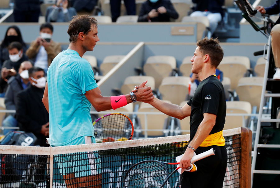 Tennis – French Open – Roland Garros, Paris, France – October 9, 2020 Spain’s Rafael Nadal shakes hands with Argentina’s Diego Schwartzman after winning the semi final match REUTERS/Charles Platiau