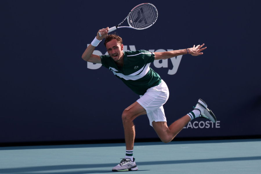 Mar 30, 2021; Miami, Florida, USA; Daniil Medvedev of Russia hits a forehand against Frances Tiafoe of the United States (not pictured) in the fourth round in the Miami Open at Hard Rock Stadium. Mandatory Credit: Geoff Burke-USA TODAY Sports