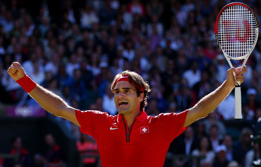 LONDON, ENGLAND – AUGUST 03: Roger Federer of Switzerland celebrates his 4-6, 7-6, 19-17 win over Juan Martin Del Potro of Argentina in the Semifinal of Men’s Singles Tennis on Day 7 of the London 2012 Olympic Games at Wimbledon on August 3, 2012 in London, England. (Photo by Clive Brunskill/Getty Images)