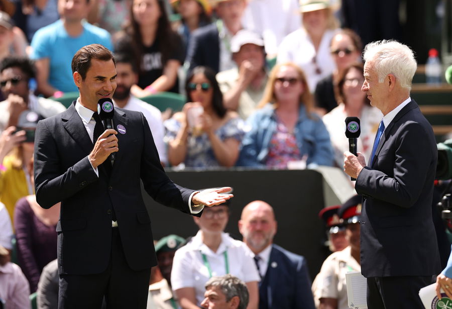 LONDON, ENGLAND – JULY 03: Roger Federer of Switzerland and John McEnroe look on during the Centre Court Centenary Celebration during day seven of The Championships Wimbledon 2022 at All England Lawn Tennis and Croquet Club on July 03, 2022 in London, England. (Photo by Ryan Pierse/Getty Images)
