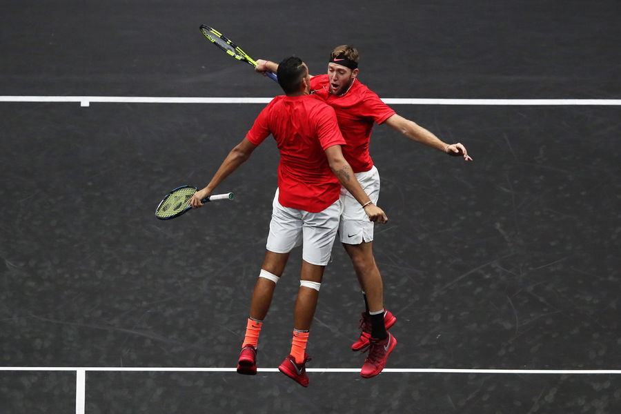PRAGUE, CZECH REPUBLIC – SEPTEMBER 22: Nick Kyrgios and Jack Sock of Team World celebrate winning a point during there doubles match against Tomas Berdych and Rafael Nadal of Team Europe on the first day of the Laver Cup on September 22, 2017 in Prague, Czech Republic. The Laver Cup consists of six European players competing against their counterparts from the rest of the World. Europe will be captained by Bjorn Borg and John McEnroe will captain the Rest of the World team. The event runs from 22-24 September. (Photo by Julian Finney/Getty Images for Laver Cup)