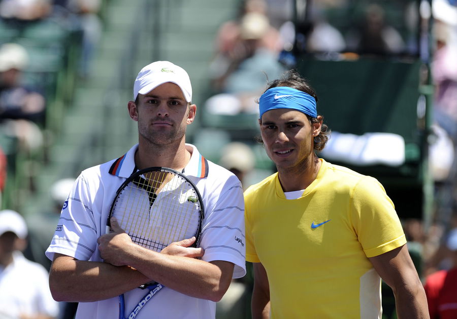 02 April 2010: Andy Roddick and Rafael Nadal before the semi-finals of the Sony Ericsson Open at the Tennis Center at Crandon Park, Key Biscayne, Florida. Roddick won the match 4-6 6-3 6-3. (Photo by Richard C. Lewis/Icon SMI/Icon Sport Media via Getty Images)