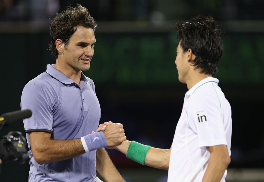 KEY BISCAYNE, FL – MARCH 26: Roger Federer of Switzerland shakes hands at the net after his three-set defeat by Kei Nishikori of Japan during their quarterfinal round match during day 10 at the Sony Open at Crandon Park Tennis Center on March 26, 2014, in Key Biscayne, Florida. (Photo by Clive Brunskill/Getty Images)