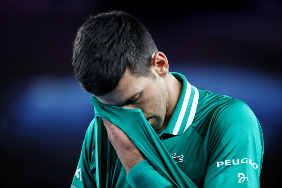 Tennis – Australian Open – Men’s Singles Final – Melbourne Park, Melbourne, Australia, February 21, 2021 Serbia’s Novak Djokovic reacts during his final match against Russia’s Daniil Medvedev REUTERS/Asanka Brendon Ratnayake