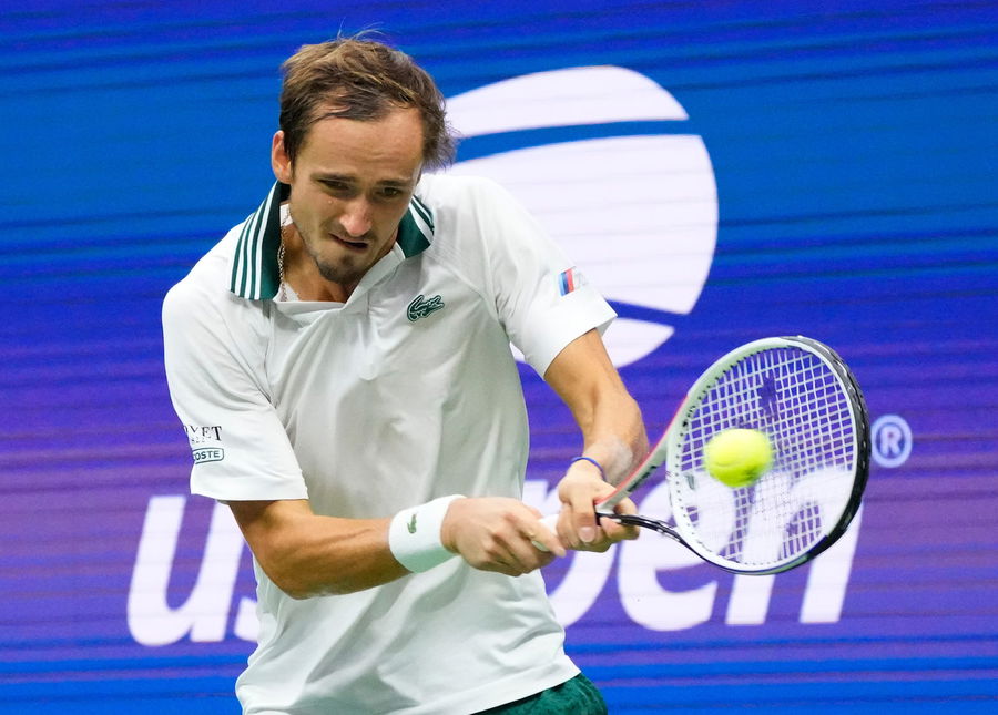 Sep 5, 2021; Flushing, NY, USA; Daniil Medvedev of Russia hits to Daniel Evans (not pictured) of Great Britain. Day seven of the 2021 U.S. Open tennis tournament at USTA Billie Jean King National Tennis Center. Mandatory Credit: Robert Deutsch-USA TODAY Sports