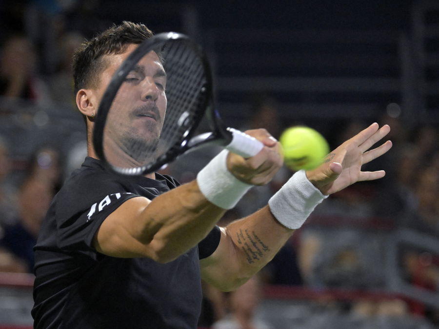 Aug 7, 2024; Montreal, Quebec, Canada; Thanasi Kokkinakis (AUS) hits a forehand against Gael Monfils (FRA) (not pictured) in first round play at IGA Stadium. Mandatory Credit: Eric Bolte-USA TODAY Sports
