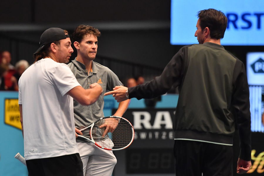 Coach Nicolas Massu, Dominic Thiem of Austria, and Wolfgang Thiem talk during a training session with Dominic Thiem of Austria and Dennis Novak of Austria on day five of the Erste Bank Open 500 at Wiener Stadthalle on October 25, 2019, in Vienna, Austria. (Photo by Andrea Kareth /SEPA.Media /Getty Images)