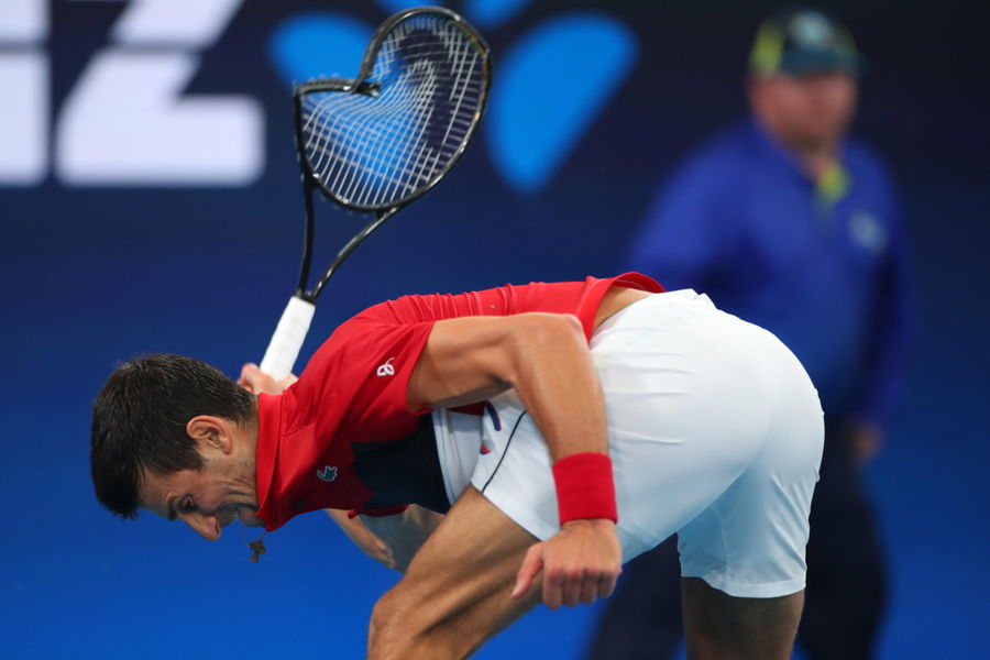 SYDNEY, AUSTRALIA – JANUARY 11: Novak Djokovic of Serbia breaks his racquet during his semi-final singles match against Daniil Medvedev of Russia on day nine of the 2020 ATP Cup at Ken Rosewall Arena on January 11, 2020 in Sydney, Australia. (Photo by Cameron Spencer/Getty Images)