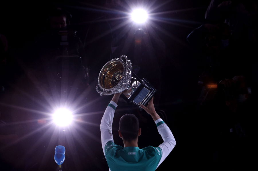 Tennis – Australian Open – Men’s Singles Final – Melbourne Park, Melbourne, Australia, February 21, 2021 Serbia’s Novak Djokovic celebrates with the trophy after winning his final match against Russia’s Daniil Medvedev REUTERS/Loren Elliott