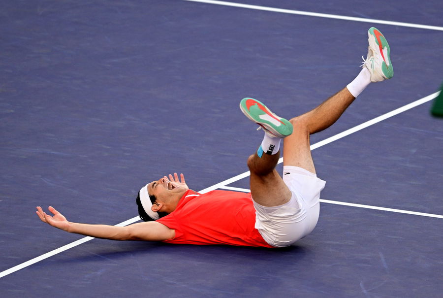 Mar 20, 2022; Indian Wells, CA, USA; Taylor Fritz (USA) celebrates match point after defeating Rafael Nadal (ESP) in the men’s final at the Indian Wells Tennis Garden. Mandatory Credit: Jayne Kamin-Oncea-USA TODAY Sports