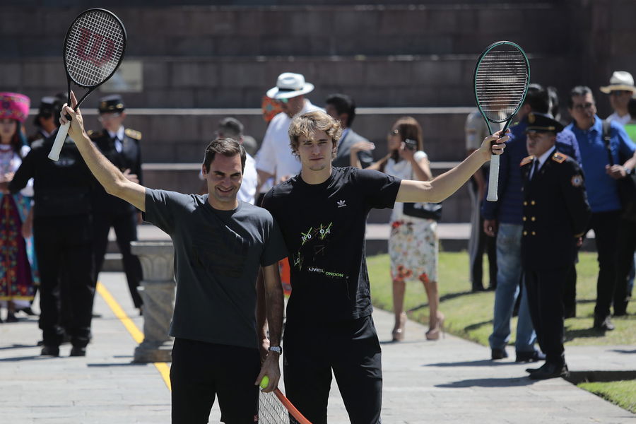 QUITO, ECUADOR – NOVEMBER 24: Roger Federer of Switzerland and Alexander Zverev of Germany wave to fans during an exhibition match between Roger Federer and Alexander Zverev at Mitad del Mundo on November 24, 2019 in Quito, Ecuador. (Photo by Agencia Press South/Getty Images)