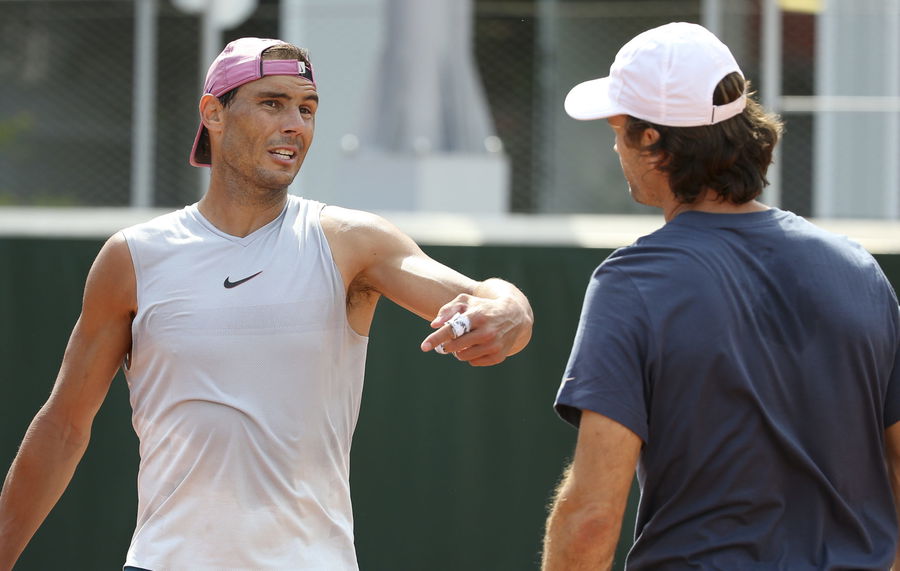 PARIS, FRANCE – MAY 29: Rafael Nadal of Spain and his coach Carlos Moya during practice ahead of the French Open 2021, Grand Slam tennis tournament at Roland-Garros stadium on May 29, 2021 in Paris, France. (Photo by John Berry/Getty Images)