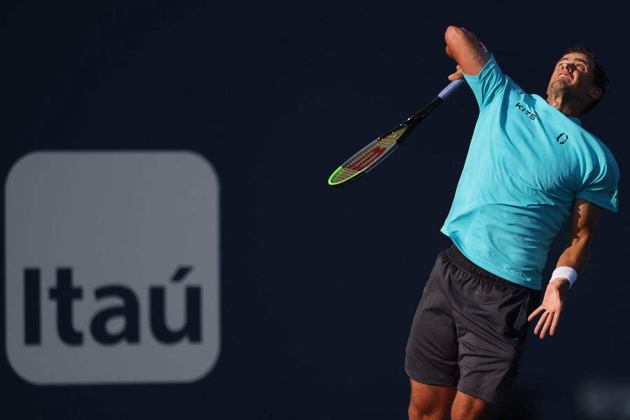 Mar 24, 2021; Miami, Florida, USA; Vasek Pospisil of Canada serves against Mackenzie McDonald of the United States (not pictured) in the first round of the Miami Open at Hard Rock Stadium. Mandatory Credit: Geoff Burke-USA TODAY Sports