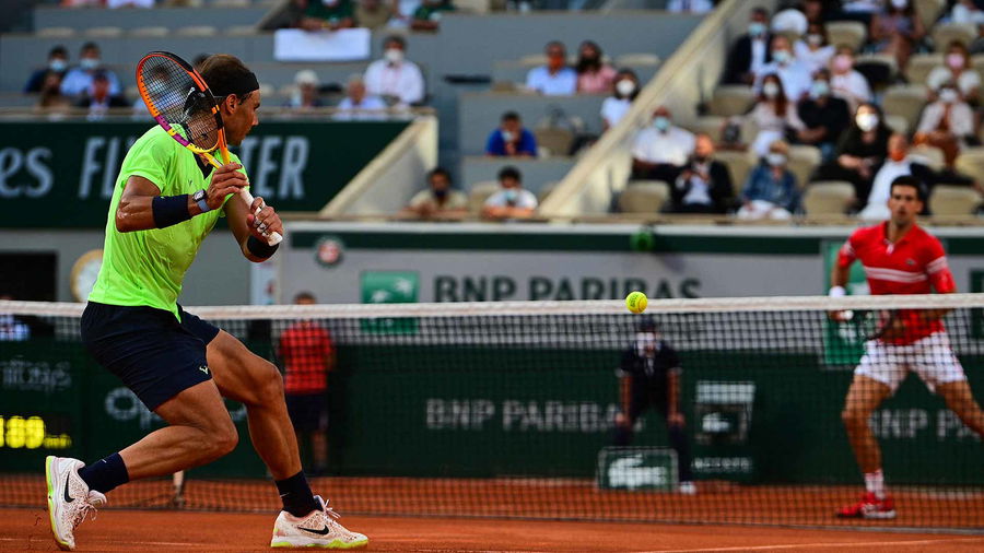 PARIS, FRANCE June 11. Rafael Nadal of Spain in action against Novak Djokovic of Serbia on Court Philippe-Chatrier during the semi finals of the singles competition at the 2021 French Open Tennis Tournament at Roland Garros on June 11th 2021 in Paris, France. (Photo by Tim Clayton/Corbis via Getty Images)