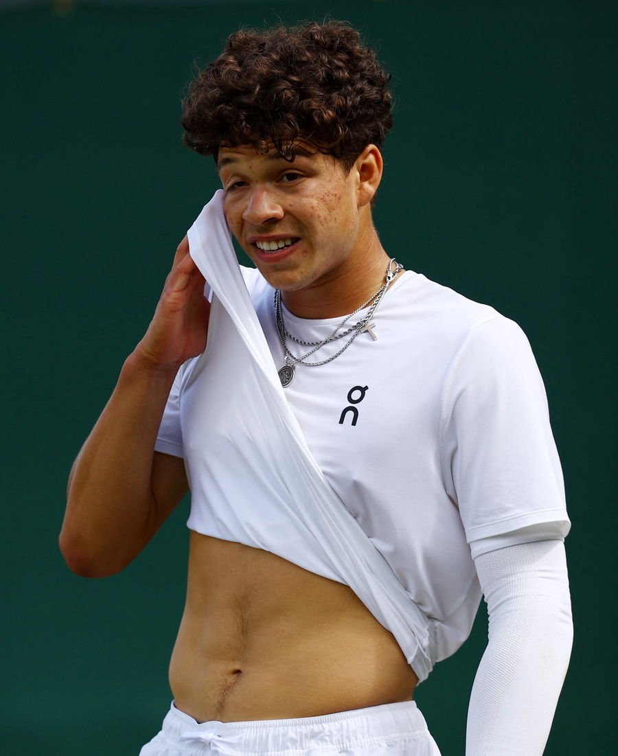 Tennis – Wimbledon – All England Lawn Tennis and Croquet Club, London, Britain – July 4, 2024 Ben Shelton of the U.S. celebrates winning his second round match against South Africa’s Lloyd Harris REUTERS/Hannah Mckay