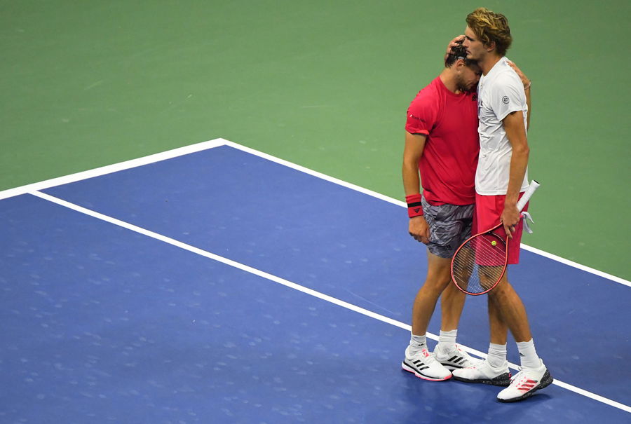 Sep 13, 2020; Flushing Meadows, New York, USA; Dominic Thiem of Austria embraces Alexander Zverev of Germany after defeating Zverev in the men’s singles final match on day 14 of the 2020 U.S. Open tennis tournament at USTA Billie Jean King National Tennis Center. Mandatory Credit: Robert Deutsch-USA TODAY Sports | Reuters