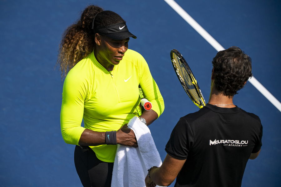 NEW YORK, NEW YORK – AUGUST 21: Serena Williams of the United States appears to have an injured hand during her practice session with her coach Patrick Moratoglou before the US Open at USTA Billie Jean King National Tennis Center on August 21, 2019 in New York City. (Photo by TPN/Getty Images)