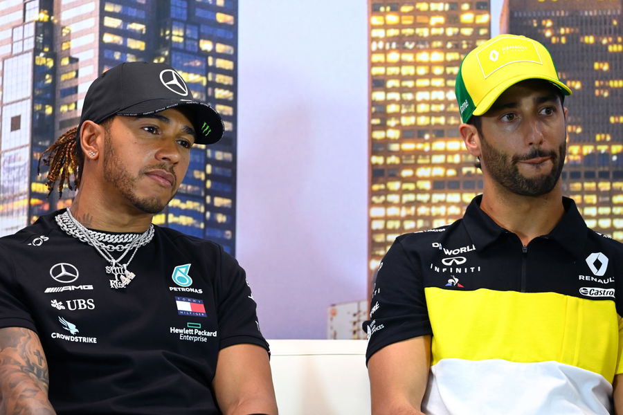 MELBOURNE, AUSTRALIA – MARCH 12: Lewis Hamilton of Great Britain and Mercedes GP and Daniel Ricciardo of Australia and Renault Sport F1 look on during a press conference during previews ahead of the F1 Grand Prix of Australia at Melbourne Grand Prix Circuit on March 12, 2020 in Melbourne, Australia. (Photo by Clive Mason/Getty Images)