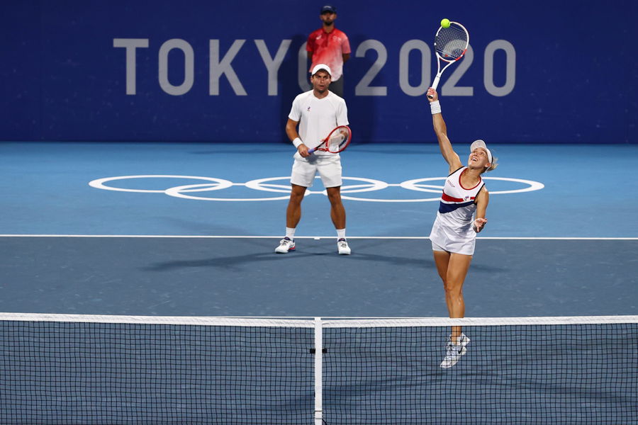 Tokyo 2020 Olympics – Tennis – Mixed Doubles – Semifinal – Ariake Tennis Park, Tokyo, Japan – July 30, 2021. Aslan Karatsev of the Russian Olympic Committee and Elena Vesnina of the Russian Olympic Committee in action during their semifinal match against Nina Stojanovic of Serbia and Novak Djokovic of Serbia REUTERS/Edgar Su