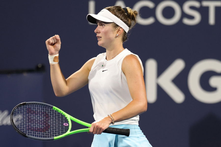 Mar 30, 2021; Miami, Florida, USA; Elina Svitolina of Ukraine reacts after winning a point against Anastasija Sevastova of Latvia (not pictured) in a women’s singles quarterfinal in the Miami Open at Hard Rock Stadium. Mandatory Credit: Geoff Burke-USA TODAY Sports