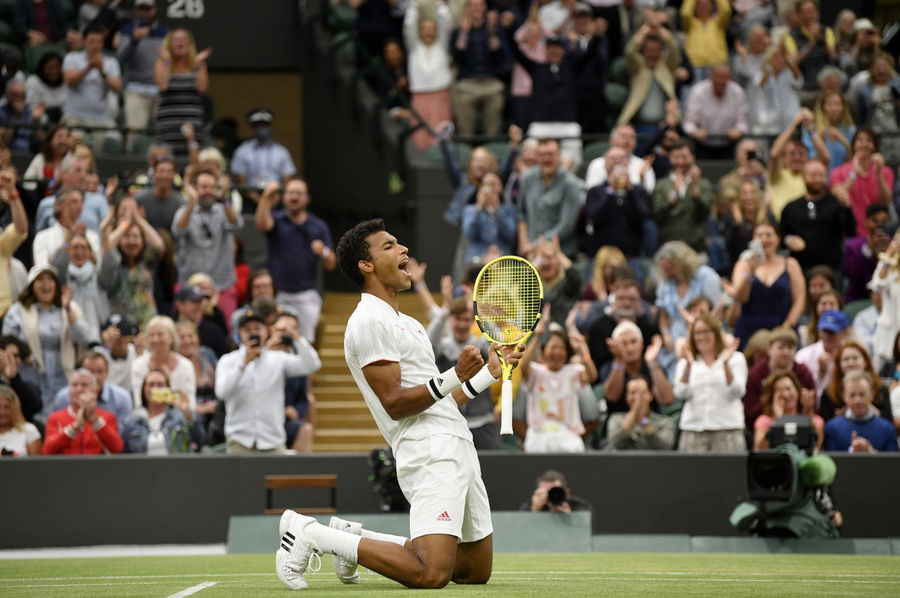 Tennis – Wimbledon – All England Lawn Tennis and Croquet Club, London, Britain – July 5, 2021 Canada’s Felix Auger Aliassime celebrates winning his fourth round match against Germany’s Alexander Zverev REUTERS/Toby Melville