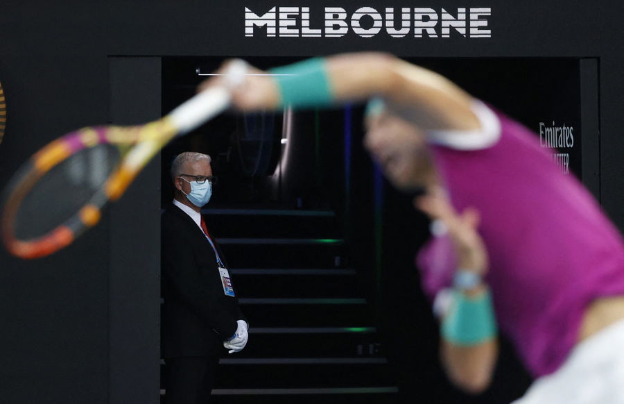 Tennis – Australian Open – Men’s Singles Final – Melbourne Park, Melbourne, Australia – January 30, 2022. Spain’s Rafael Nadal is seen in action as a security guard looks on during the final against Russia’s Daniil Medvedev. REUTERS/Asanka Brendon Ratnayake