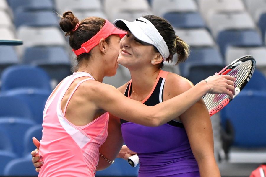 Tennis – Australian Open – Melbourne Park, Melbourne, Australia, February 8, 2021 Canada’s Bianca Andreescu with Romania’s Mihaela Buzarnescu after their first-round match REUTERS/Jaimi Joy