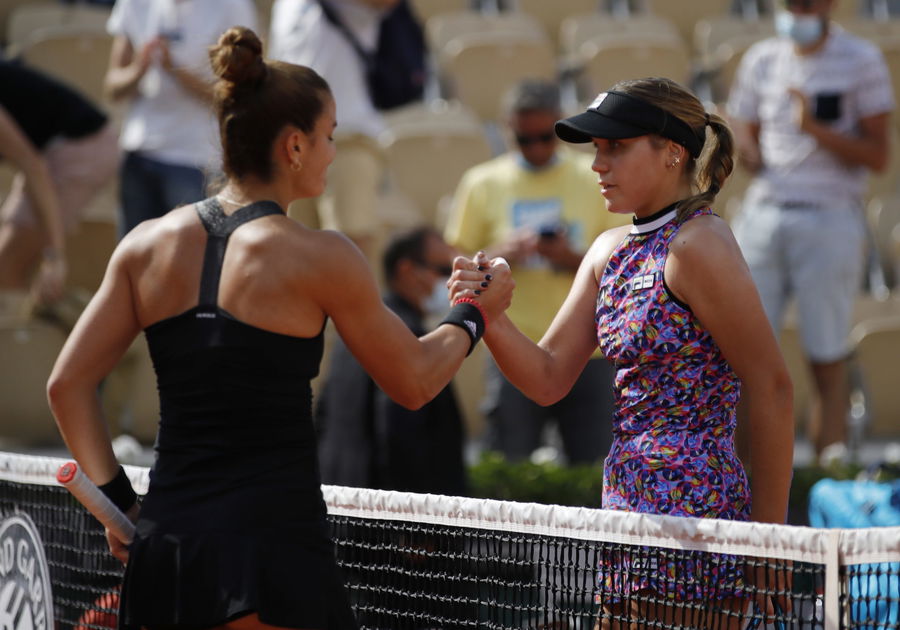 Tennis – French Open – Roland Garros, Paris, France – June 7, 2021 Greece’s Maria Sakkari shakes hands with Sofia Kenin of the U.S. after winning their fourth round match REUTERS/Sarah Meyssonnier