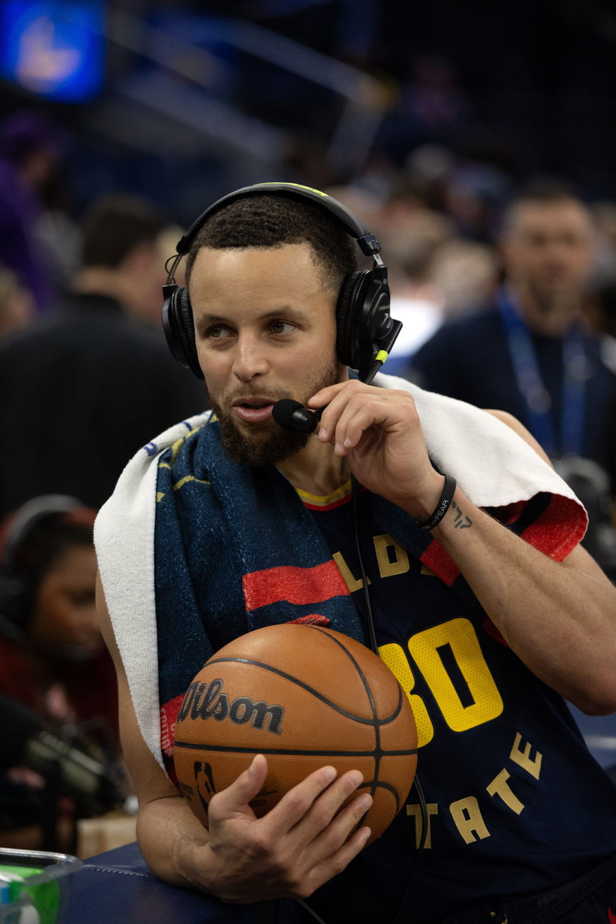Mar 13, 2025; San Francisco, California, USA; Golden State Warriors guard Stephen Curry (30) talks to a radio interviewer following the game against the Sacramento Kings at Chase Center. Mandatory Credit: D. Ross Cameron-Imagn Images